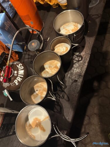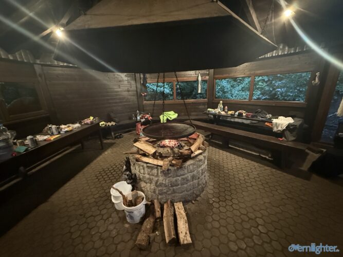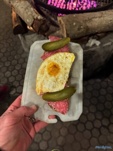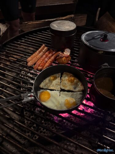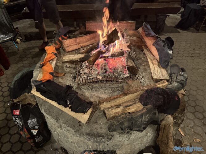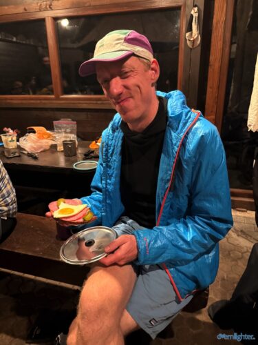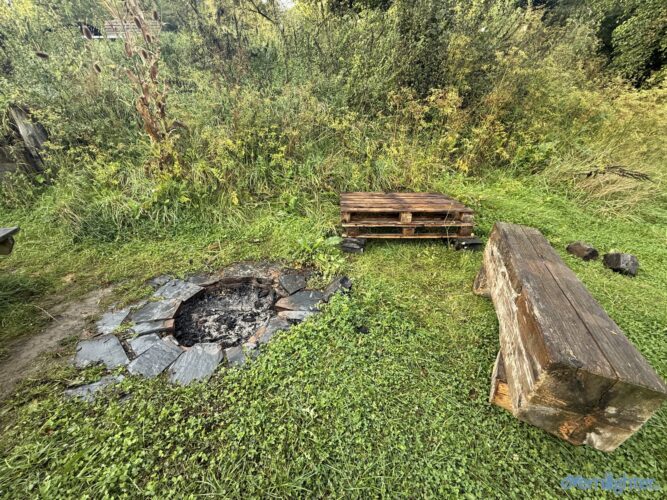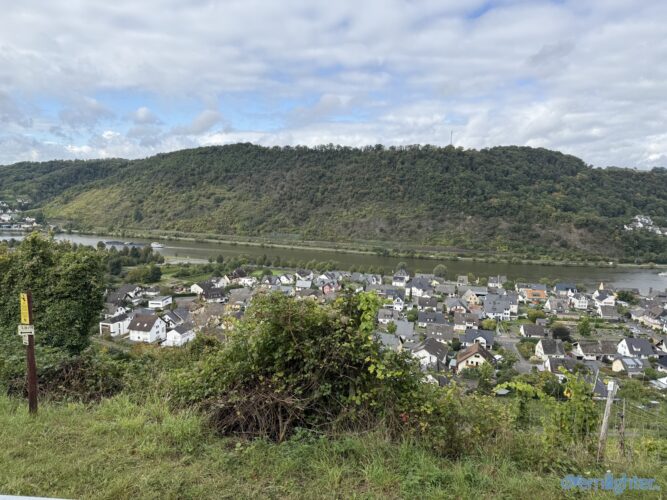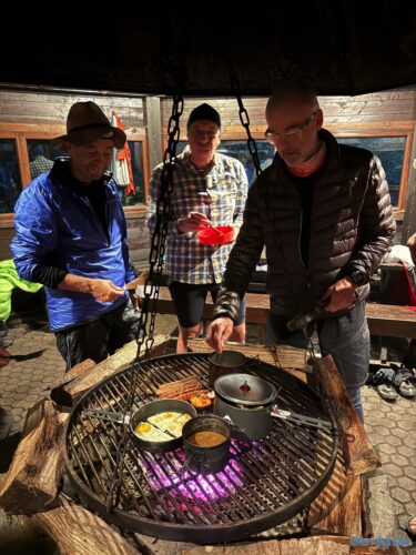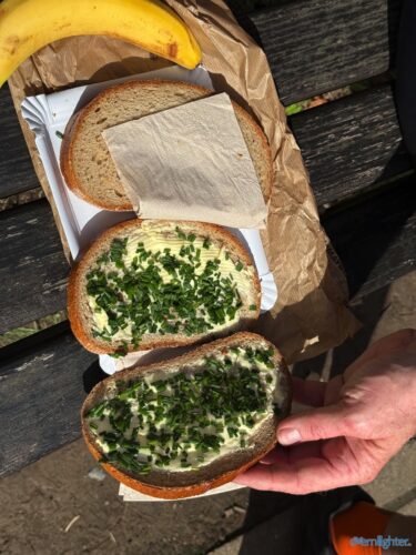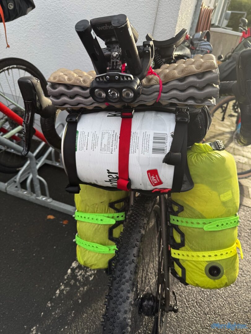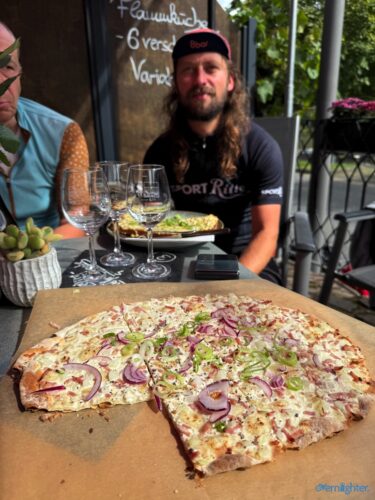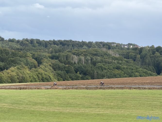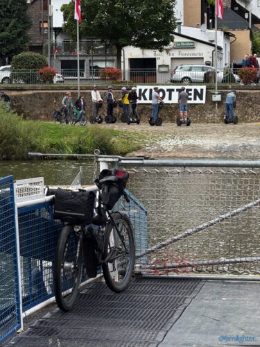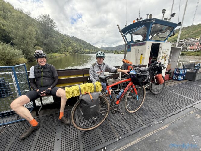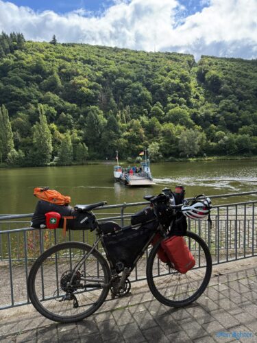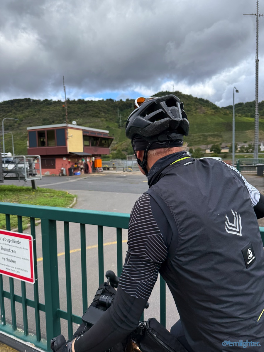 Wir verließen den Rhein Richtung Westen, fuhren ein Stück an der Mosel entlang und dann weiter nach Westen in die Vulkaneifel. Im Detail: Die Strecke erschien mit 88 km und 1700 hm erstmal ziemlich anspruchsvoll, aber es waren im wesentlichen zwei längere Anstiege, einmal aus dem Rheintal hoch und einmal von der Mosel hoch. Von der Mosel hoch ging es nur auf Teer und der Abschnitt ließ sich gut fahren, auch wenn er hart war. Die Abfahrt zur Mosel brachte uns ins Dorf Alken und an dieses hatte ich gute Erinnerungen: Mit meinem Bruder auf dem Tandem war ich bereits einmal hier. Zwischen diesen beiden steilen Passagen ging es 25 km flach die Mosel entlang. Dabei hatte Holger mit der Schleuse Müden, die 2024 wegen eines Unfalls unerwartet Berühmtheit erfuhr (Wer erinnert sich?), erledigt. Mit der Fähre in Klotten setzten wir über, labten uns ein wenig und hämmerten uns dann Laktat in die Beine beim Anstieg aus dem Tal. Das Wetter kippte und erste Regentropfen kündigten Schauer an, die einige von uns übel auf freiem Feld erwischten. Entlang einiger Mare ging es weiter und kurz vor dem Ende konnten wir optional den Aussichtspunkt Dronketurm besuchen. Die 200 Extra-Höhenmeter hatten sich einige (u.a. ich) gespart. In Daun kauften wir ein und erreichten eine “Glamping-Grillhütte” mit WC, Warmwasser und pompöser Feuerstelle. Genau das Richtige nach diesem nasskalten Tag! Am abendlichen Feuer kredenzte Holger “Strammen Max” für jeden und erfüllte damit – leicht abgewandelt – die Aufgabe drei. Einiges war unterwegs skurril, wir betrachteten Aufgabe zwei damit auch als erfolgreich realisiert.